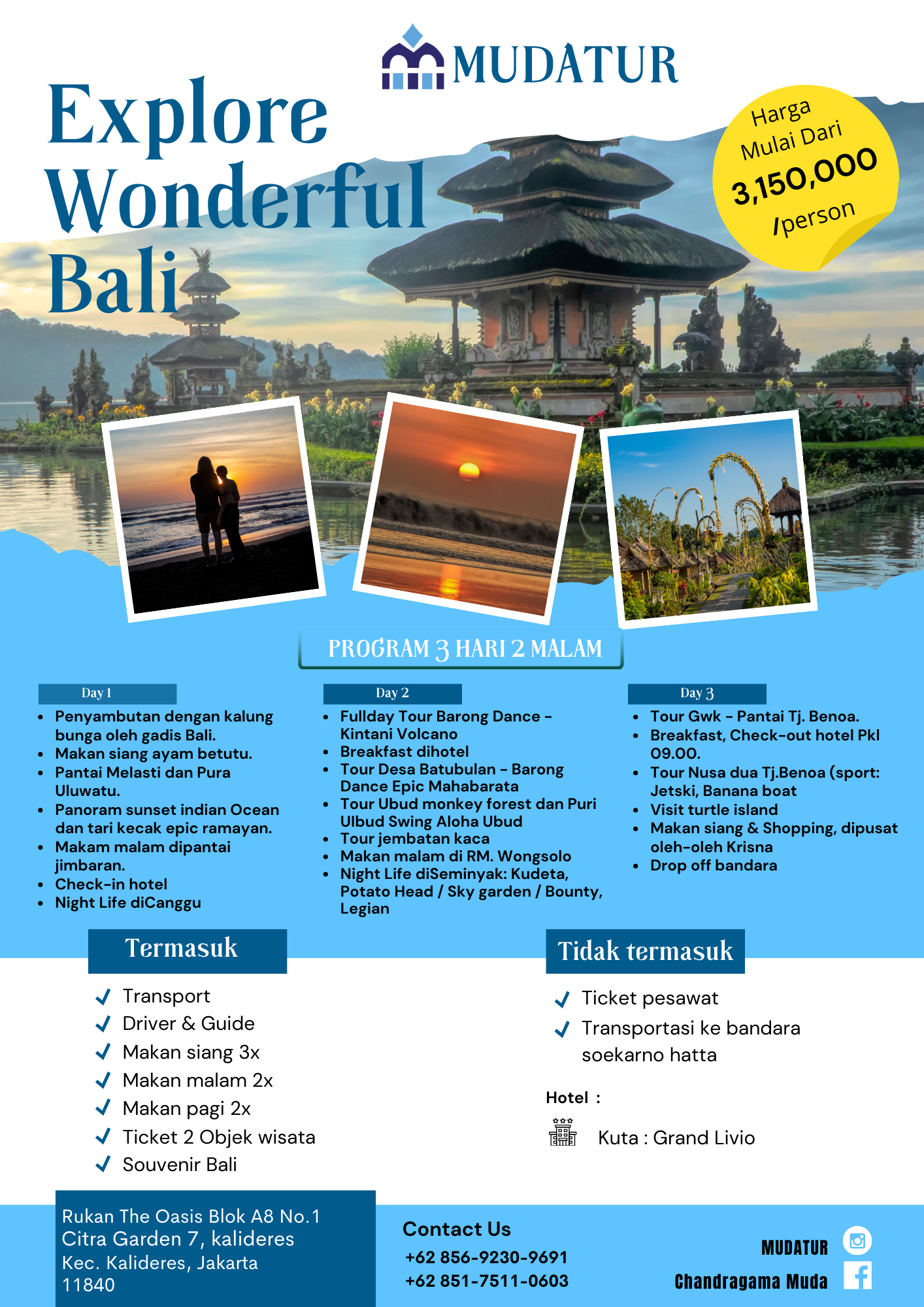Destinasi : PANTAI MELASTI, PURA ULUWATU, TARI KECAK, SUNSET INDIAN OCEAN, PANTAI JIMBARAN, BARONG DANCE, VISIT G.W.K & PANTAI TJ BENOA...